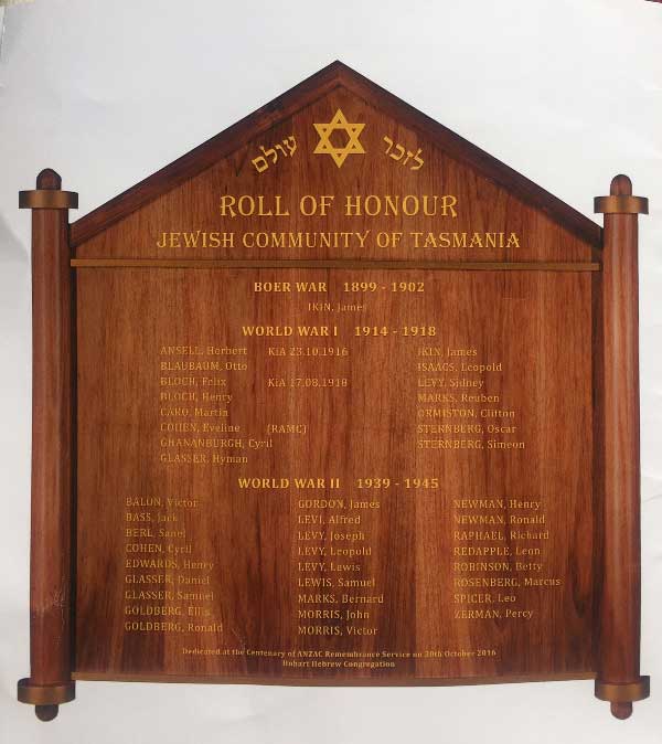 In particular, for the Centenary of ANZAC, mention was made of the 16 members of the Tasmanian Jewish Community who served in World War 1, especially the three Tasmanian Jewish Soldiers who made the supreme sacrifice.